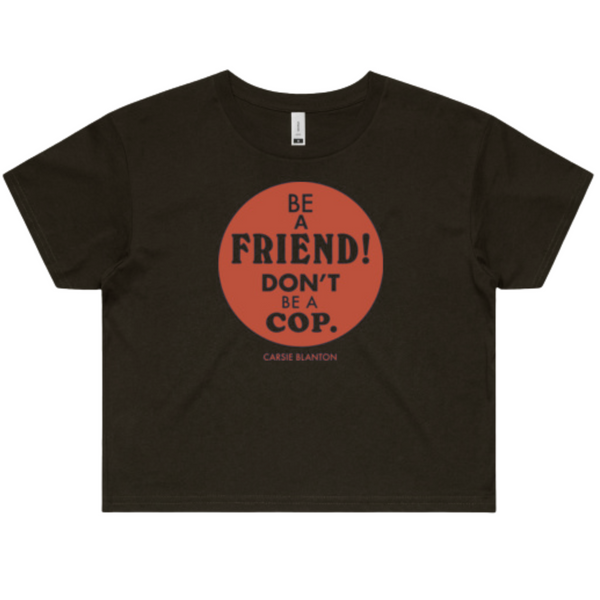 Be A Friend, Don't Be A Cop Black Crop Tee. Designed by Madalyn Stefanak. Limited quantities!